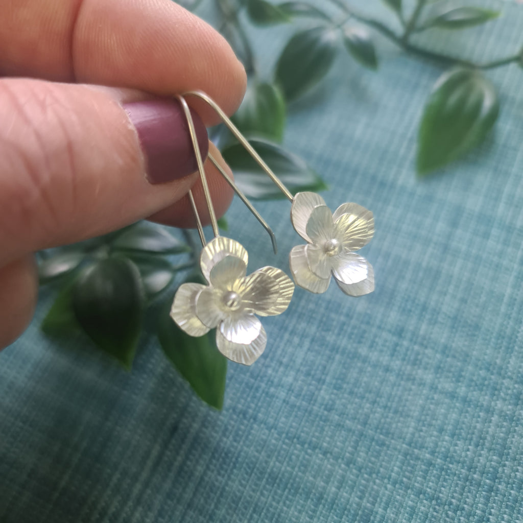 The flowers measure 2cm, in diameter although as the flowers are sawn by hand some natural small variation is to be expected. The total earring length is approximately 4cm.