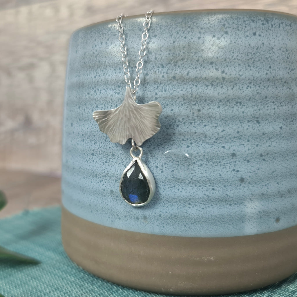 The unique fan shape of a ginkgo leaf recreated in silver, with a gorgeous teardrop faceted labradorite hanging below.